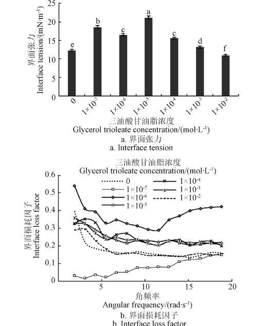 三油酸甘油酯濃度對油水界面特性的影響見圖6。由圖6可見,當麥胚LA濃度為1.70×10-6mol/L時,油水界面張力隨癸烷中三油酸甘油酯濃度的增加呈現(xiàn)先增加后減小的變化規(guī)律;當三油酸甘油酯濃度介于10-5~10-3mol/L時,相同角頻率時界面損耗因子隨著濃度增加無明顯變化規(guī)律。此外,在試驗過程中,界面張力隨時間延長呈現(xiàn)一定下降趨勢,這說明麥胚LA與三油酸甘油酯的水解過程也會對界面張力產(chǎn)生一定影響。原因在于,在界面體系中,三油酸甘油酯可被麥胚LA水解,產(chǎn)生小分子的油酸等,三油酸甘油酯與麥胚LA組成的界面發(fā)生變化,進而影響界面特性。