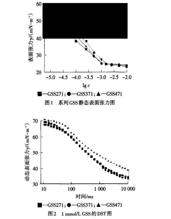 雙磺基琥珀酸酯磺酸鈉(簡稱GSS)通過柔性連接基將兩個傳統的琥珀酸酯鹽連接而成,連接基使GSS分子中兩個離子頭基間的靜電斥力大大削弱,同時加強了碳氫鏈間的疏水結合力,使GSS具有比單鏈琥珀酸酯磺酸鹽更低的臨界表面張力。