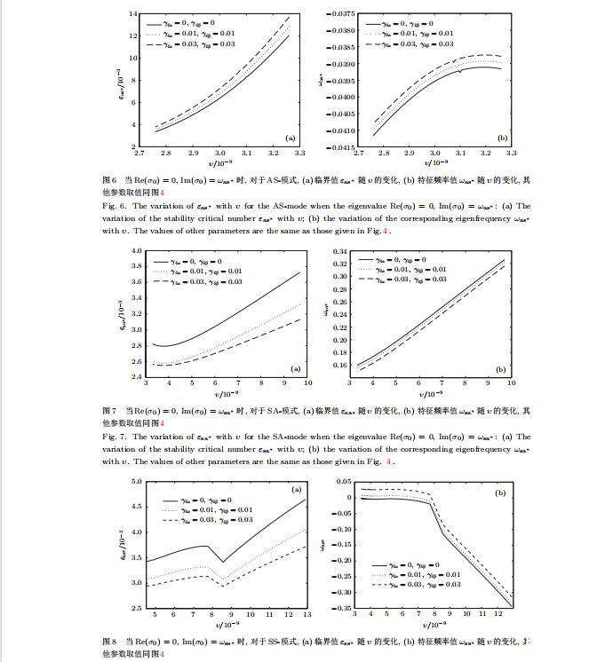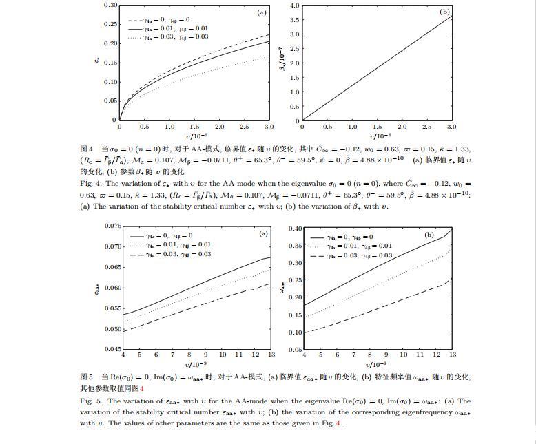 由量子化條件可以看出特征值σ0是關(guān)于參數(shù)ε和γ4的隱函數(shù).任意給定參數(shù)ε和γ4,可以得到一個(gè)復(fù)數(shù)值σ0.為了更好地闡明生長條件對共晶生長系統(tǒng)的影響,引入無量綱參數(shù)[11,12]υ=?c,αV/κD,它反映拉速V的大小;?β=??c,α(G)D/mαCe,它反映溫度梯度(G)D的大小.通過化簡可以知道,υ=ε3ˉΓα,?β=υG/M.本文采用與Xu[23]研究枝晶的形態(tài)穩(wěn)定性相似的方法,對于四種震蕩模式得到各自對應(yīng)的穩(wěn)定臨界值εaa?,εas?,εsa?和εss?.共晶生長系統(tǒng)穩(wěn)定的選擇判據(jù)為: