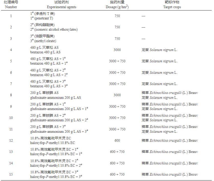 植物葉片性質的不同會影響藥液的潤濕和持留能力。接觸角測定結果(表3)顯示:無論靶標作物是禾本科的稗草還是闊葉科的龍葵,2#增效劑的接觸角均最小,且3種除草劑中添加2#增效劑后接觸角減小的程度最大(6,10,14),添加3#增效劑后接觸角減小的程度最小,因此,2#增效劑減小接觸角的性能最好。