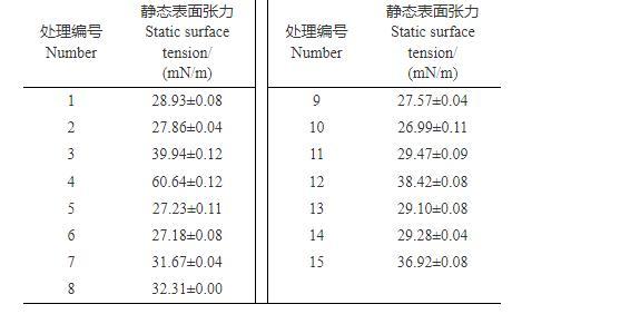 1.2.1靜態表面張力測定參照文獻方法測定。在(25±1)℃下,用0.3 mm的鉑金環(外徑20.30 mm,周長61.89 mm,密度0.998 g/mL)在全自動張力儀上先用純水進行校準,然后測定表1中15種處理的靜態表面張力,每個試驗至少重復3次,結果取平均值,用Origin Pro軟件(9.0版,OriginLab公司)處理數據。