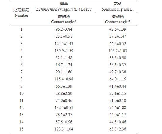表3 15種處理作用于靶標作物時的接觸角