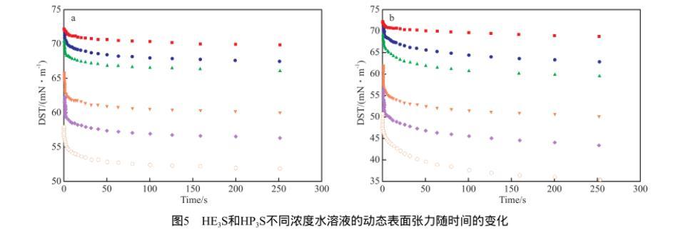 圖5為298 K時(shí)不同濃度的HE3S和HP3S水溶液的動態(tài)表面張力隨時(shí)間的變化。