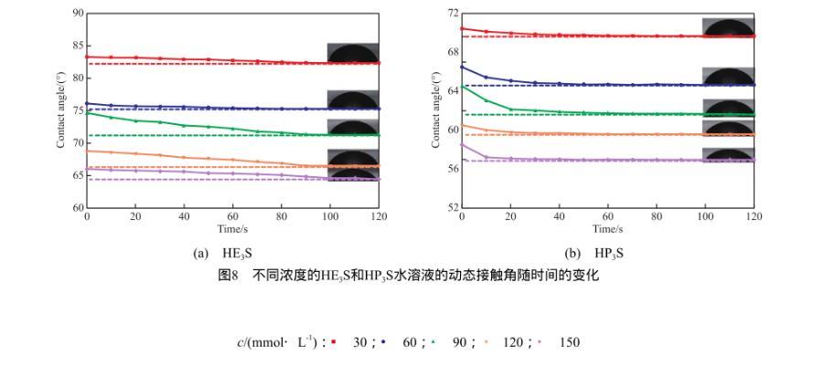 圖8不同濃度的HE3S和HP3S水溶液的動態(tài)接觸角隨時(shí)間的變化