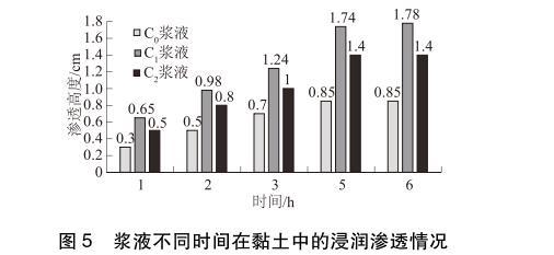 漿液浸潤滲透速度隨時間變化的關系,其原因是漿液混合后,隨著時間的延長,分子量不斷增加,導致漿液的表面張力和接觸角不斷增大,從而引起漿液浸潤滲透能力隨時間延長而不斷下降。由于表面活性劑降低了漿液的表面張力和接觸角,所以能夠提高漿液在黏土中的浸潤滲透能力,有利于漿液在黏土中的滲透擴散。C1漿液在黏土中的浸潤滲透高度要大于C2漿液在黏土中的浸潤滲透高度,說明表面活性劑S2分子結構側鏈上多了乙氧基基團,雖然親水性增強,但滲透性比側鏈上沒有乙氧基基團的S1表面活性劑的改性效果差。