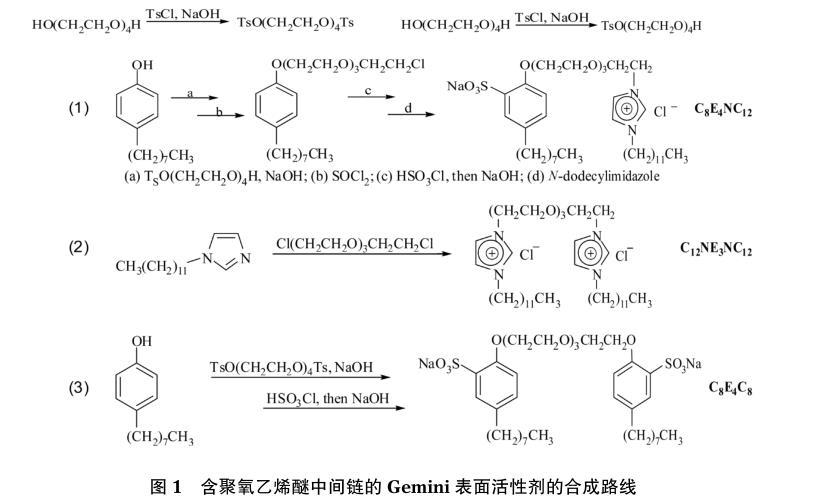 Gemini表面活性劑是具有雙親水雙親油特殊結構的一類表面活性劑,因其結構的特殊性和分子結構設計的多樣性,使其在性質和應用方面有別于其他表面活性劑,具有表面活性更高,臨界膠束濃度(cmc)更低等特點。