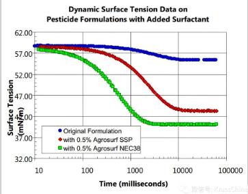 我們分別用Kibron動(dòng)態(tài)表面張力儀,DSA100液滴形狀分析儀,從動(dòng)態(tài)表面張力,接觸角和滾動(dòng)角的角度,來全面衡量和評(píng)價(jià)0.5wt%的Agrosurf SSP、0.5wt%的Agrosurf NEC38對(duì)農(nóng)藥的噴灑效果。