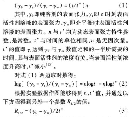 其中,即純溶劑的表面張力,即t時刻表面活性劑溶液的表面張力,即介平衡時表面活性劑溶液的表面張力。n與t均為動態表面張力特性參數,是常數。t與時間的單位相同,n是無因次量。t的值即達到。與7數值之和的一半所需要的時間,其與表面活性劑的濃度有關,當表面活性劑濃度升高時,t減小。
