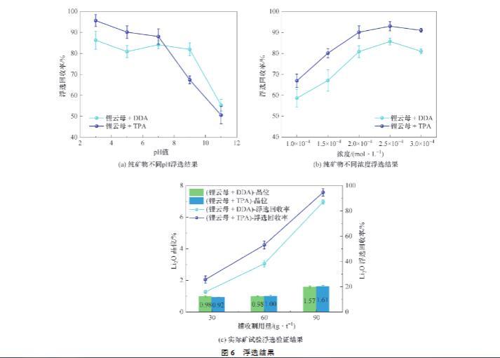 (3)在不同濃度下,TPA均得到比DDA更低的表面張力,說明TPA可能具有更多的泡沫容積,泡沫容積結果驗證了表面張力結果。在不同濃度下,TPA均得到比DDA更高的黏度,說明TPA產生的泡沫更穩定,泡沫半衰期結果驗證了黏度結果。表面張力試驗、黏度試驗、泡沫容積試驗、泡沫半衰期試驗共同證明TPA更優越的泡沫性能。將TPA應用于浮選中,能夠增大氣泡與鋰云母的碰撞及接觸概率,增強鋰云母與氣泡的黏附,減少鋰云母與氣泡的脫附,進而提高浮選回收率。