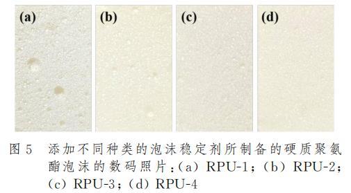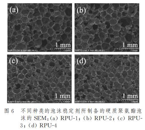 泡沫穩定劑的存在對于硬質聚氨酯泡沫性能影響在宏觀上有著十分顯著的體現。圖5是添加不同種類的泡沫穩定劑后制樣得到的硬質聚氨酯泡沫橫截面的數碼照片。結果表明,接枝APEG鏈段的PAVE-5和PGVF-6泡沫穩定劑所制備的聚氨酯泡沫RPU-3和RPU-4,其泡孔結構相較于市售產品所制備的聚氨酯泡沫展現出了更加細膩均勻的泡孔結構,而市售產品所形成的泡沫則表現出較為粗糙且孔徑不均勻的泡孔結構。這表明親水結構有利于泡沫穩定劑均勻分散在多元醇中并使得反應充分進行,泡孔尺寸細小致密,有利于改善硬質聚氨酯泡沫的壓縮性能。