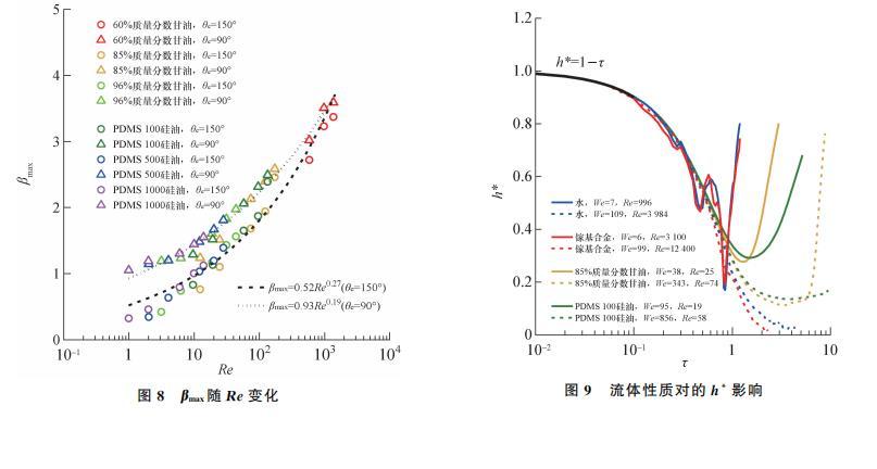 4)對(duì)于以往鮮有研究的高黏度PDMS1000硅油和超高表面張力的鎵基合金,盡管這2種流體物性較為特殊,但其碰撞過(guò)程仍主要受Re和We影響。但當(dāng)PDMS1000硅油以低速碰撞壁面時(shí),Re接近于1,此時(shí)液滴的入射動(dòng)能很快通過(guò)黏性力耗散殆盡,慣性力作用可忽略不計(jì),液滴在壁面上近似于自發(fā)鋪展,導(dǎo)致βmax和hmin*主要由液滴初始動(dòng)能和壁面潤(rùn)濕性決定,偏離結(jié)論2和3中與We、Re之間的冪函數(shù)關(guān)系。
