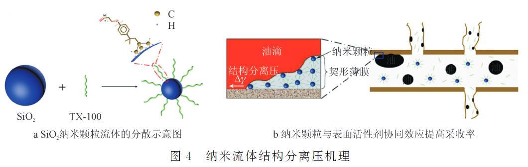 WasanD等提出的“結構分離壓”理論,解釋了納米流體在油-固界面時這種壓力作用將油膜或油滴從巖石表面分離的過程。通過進一步的研究發現,這種結構分離壓力的大小和速度受到納米顆粒濃度和液滴體積的影響。ZHAO等以非離子表面活性劑(TX-100)作為分散劑和增效劑,將SiO2納米顆粒分散在水中形成SiO2納米流體(如圖4a所示),并對SiO2納米流體剝離固體表面油滴的能力進行了探究。SiO2納米流體和表面活性劑(TX-100)均具有將油滴從巖石表面脫離的能力。與表面活性劑(TX-100)相比,當添加SiO2納米顆粒時,納米流體可以在油/固體/納米流體三相接觸區形成薄膜從而產生結構分離壓,將油滴從巖石表面剝離。由于表面活性劑天然剝離油滴的能力和SiO2納米顆粒的結構分離壓力機理(如圖4b所示),SiO2納米流體具有優秀的滲吸提高采收率能力。