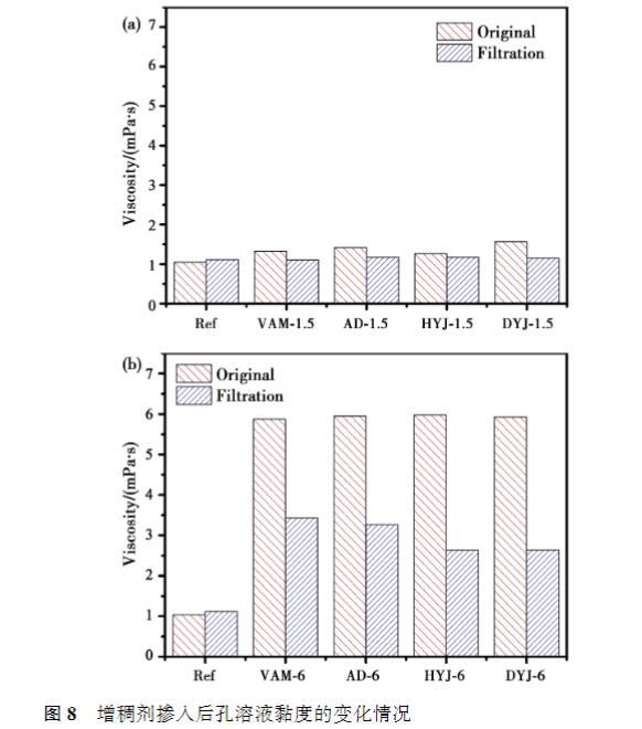 HYJ和DYJ溶液的表面張力與純水相近,VAM和AD溶液的表面張力則顯著低于純水。當增稠劑加入砂漿中后,抽濾得到的孔溶液性質發生改變:對于VAM和AD,孔溶液的表面張力相對原溶液略微增大1.50%——4.44%,黏度下降了16.21%——45.12%;對于HYJ和DYJ,孔溶液的表面張力相對原溶液下降幅度達到16.97%——23.57%,黏度僅下降6.82%——55.94%.復雜離子環境使孔溶液黏度有所下降,增稠劑摻量越高,黏度下降程度越大。