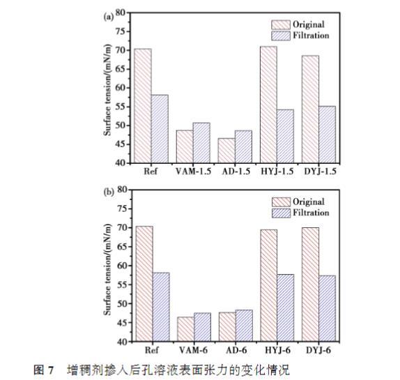 相同摻量下,DYJ的黏度最高,其次是HYJ,VAM和AD黏度在低摻量下接近,摻量達到0.10%之后,VAM黏度高于AD;VAM和AD的黏度隨著摻量的提高緩慢增大,而HYJ和DYJ溶液的黏度隨摻量的提高迅速提高,尤其是DYJ的增長幅度更為顯著。總體來看,增稠劑分子量越大,相同摻量時溶液的黏度越高。從表面張力的結果來看,相同摻量下,HYJ溶液的表面張力最高,其次是DYJ,VAM和AD的表面張力顯著低于其他兩種增稠劑,且AD略微高于VAM.
