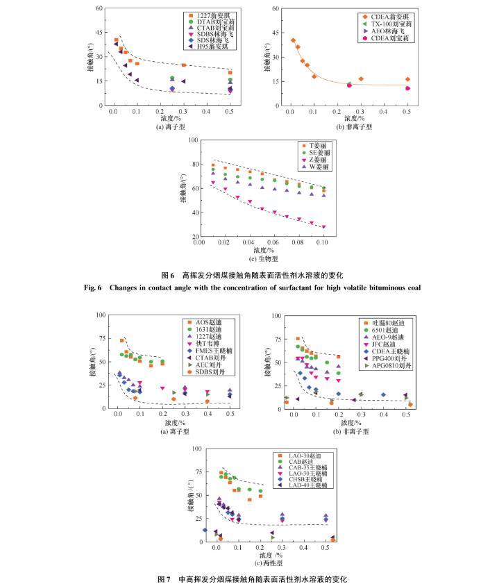 圖7中高揮發(fā)分煙煤接觸角隨表面活性劑水溶液的變化