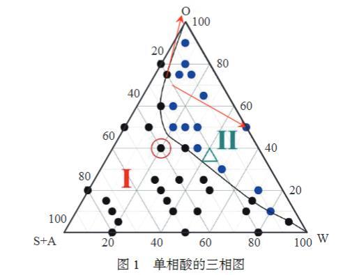 通過擬三元相圖制備單相酸相圖,根據油相(O)、酸相(W)、表面活性劑(S)+助表面活性劑(A)的比例進行三相圖的繪制。室溫下,固定油相(O)的加量,固定非離子表面活性劑(S1)與陽離子表面活性劑(S2)的質量比,固定表面活性劑(S,S=S1+S2)與助表面活性劑(A)的質量比。將不同比例下的液體進行離心,然后進行觀測,觀察體系由澄清透明(一相)變為混濁(二相)的相變過程,在每次發生相變的同時記錄所滴加鹽酸的量,以O、S+A、W為三相,繪制擬三元相圖,見圖1。由圖1可知,在圖1的紅圈標記區域,配方的經濟性最好,是維持單相區域最小的表面活性劑用量(S+A),且該配方下的單相酸遇水遇油后仍可在較大范圍內保持單相。