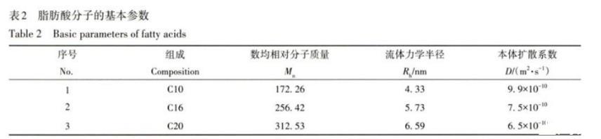 對比不同鏈長脂肪酸在不同質量濃度時的動態界面張力(圖9A-9C),發現雖然脂肪酸在正辛烷中的擴散系數隨著碳鏈的增長而減小(表2),但添加高質量濃度C20酸時,界面張力值到達平衡的時間明顯縮短,這表明脂肪酸烷基鏈長度會影響脂肪酸在界面的性質。并且發現脂肪酸烷基鏈越長,與NH2-PEG-GO協同穩定的水-正辛烷界面張力越低。并且隨著脂肪酸質量濃度增加,烷基鏈鏈長增加對界面張力降低效果越明顯(圖9D)。