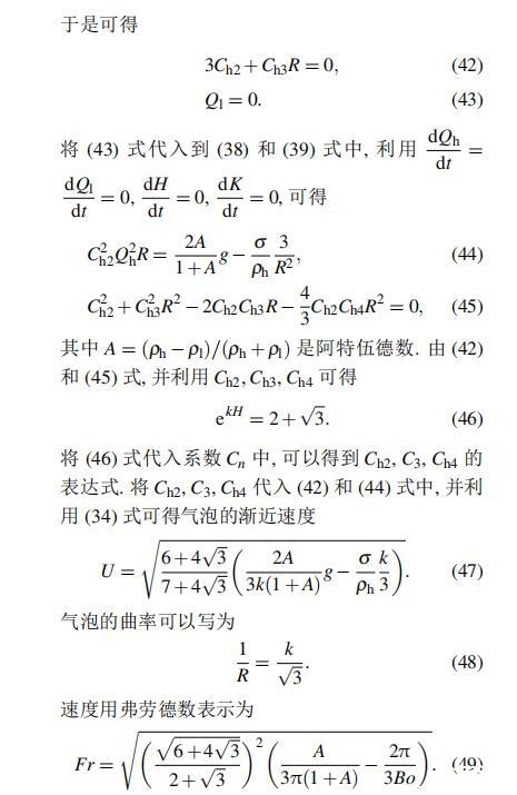 將具有簡單速度勢的Layzer模型和Zufiria模型推廣至非理想流體情況,并分別利用這兩種模型研究了界面張力對Rayleigh-Taylor不穩(wěn)定性的影響。首先得到了兩種模型下氣泡的漸近速度和漸近曲率的解析表達式;其次系統(tǒng)研究了界面張力對氣泡的漸近速度和漸近曲率的影響;最后將兩種模型進行了比較,并將氣泡的漸近速度和數(shù)值模擬進行了比較。研究表明:界面張力壓低了氣泡的速度,但對曲率沒有影響;利用簡單速度勢的Layzer模型所得的氣泡的漸近速度比復雜速度勢的Layzer模型的值小,但是比Zufiria模型的值大;當阿特伍德數(shù)等于1時,簡單速度勢的Layzer模型和復雜速度勢的Layzer模型給出的結果一致。