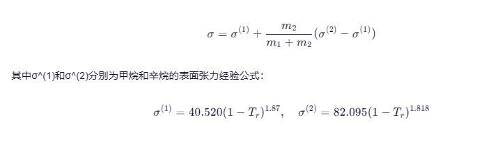 其中σ^(1)和σ^(2)分別為甲烷和辛烷的表面張力經驗公式: