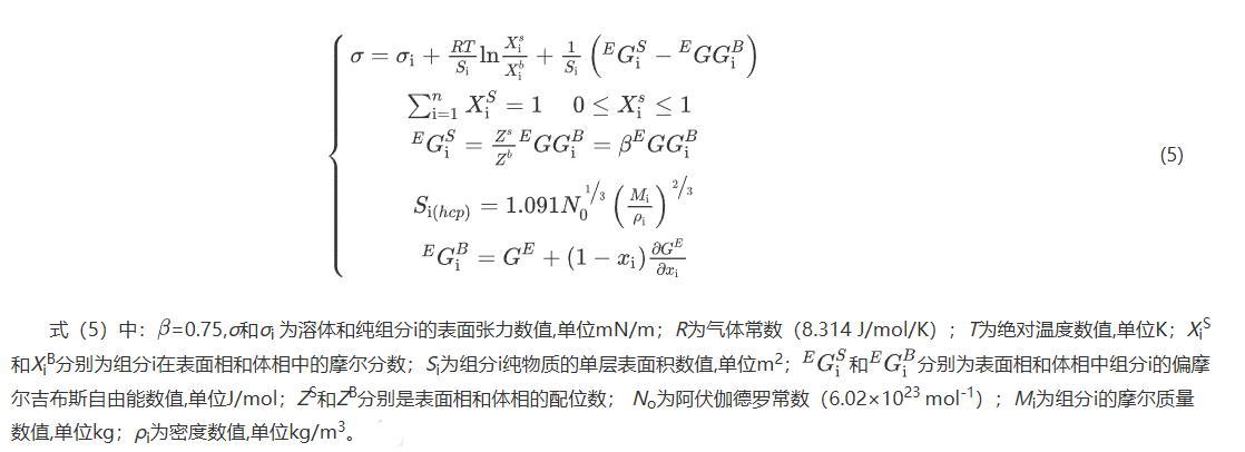 式(5)中:=0.75,σ和σi為溶體和純組分i的表面張力數(shù)值,單位mN/m;R為氣體常數(shù)(8.314 J/mol/K);T為絕對(duì)溫度數(shù)值,單位K;XiS和XiB分別為組分i在表面相和體相中的摩爾分?jǐn)?shù);Si為組分i純物質(zhì)的單層表面積數(shù)值,單位m2;分別為表面相和體相中組分i的偏摩爾吉布斯自由能數(shù)值,單位J/mol;ZS和ZB分別是表面相和體相的配位數(shù);No為阿伏伽德羅常數(shù)(6.02×1023 mol-1);Mi為組分i的摩爾質(zhì)量數(shù)值,單位kg;ρi為密度數(shù)值,單位kg/m3。