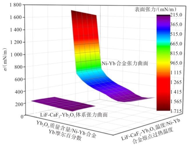 圖4 Ni-Yb合金與LiF-CaF2-Yb2O3體系表面張力曲面對(duì)比