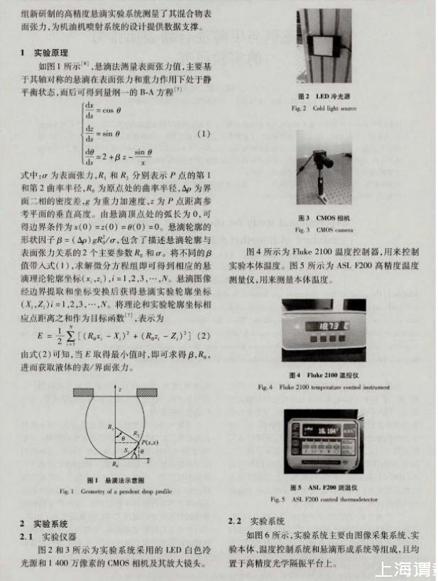 表面張力作為燃料的重要性能指標,對于燃料在發動機汽缸內的霧化過程有著重要的影響。一般地,表面張力較高會導致汽油機噴霧困難,液體燃料不易破碎成較小的液滴,延長了燃燒時間,降低了汽油機的熱效率。因此,在設計和優化汽油機噴射器時,為了達到滿意的霧化性能指標,以提高汽油機效率和降低有害污染物和顆粒排放,首先必須精確地獲取燃料在較寬的溫度范圍內的表面張力。但是,國內外現有的研究文獻表明,甲醇與二甲基亞砜混合物表面張力數據仍屬空白,因此本文將利用課題新研制的高精度懸滴實驗系統測量了其混合物表面張力,為柴油機噴射系統的設計提供數據支撐。