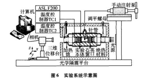 實驗本體材料為316不銹鋼,設計承壓范圍為0—20MPa,兩端設計有法蘭結構的觀察窗。懸滴通過不銹鋼針頭形成,其端口平整,外徑規格為(1.61±0.005)mm,內徑為0.3mm,通過螺紋結構緊固于本體內。采用LED白色冷光源和1400萬像素的CMOS相機及其放大鏡頭采集懸滴圖像。實驗本體溫度采用電加熱分段控制,在其非觀察面上均勻纏繞電加熱絲并利用Fluke2100溫度控制器控制其溫度,在觀察窗兩側安裝有加熱筒,并控制加熱筒的溫度高于本體溫度約5—10℃,防止在升溫的過程中窗口結霧。實驗系統的溫度范圍為20—180℃,溫度波動度好于±10mK。本體溫度采用ASL F200高精度溫度測量儀測量,校準證書顯示的全量程測溫不確定度為±10mK,Pt100溫度計由北京計量院標定,標定證書顯示的不確定度為±5mK。因此,本文實驗系統的溫度擴展不確定度為±30mK(k=2)。實驗本體通過螺紋桿懸至于環氧樹脂保溫箱體內部,并利用調平螺母調節本體的高度和水平,從而使其內部的針管處于鉛垂位置并在相機視野的中心。待本體溫度穩定30min后,開始采集懸滴圖像,每滴采集10次,間隔為3s,至少采集3個懸滴共計30張圖片,擬合計算并取平均值作為最后的實驗結果。
