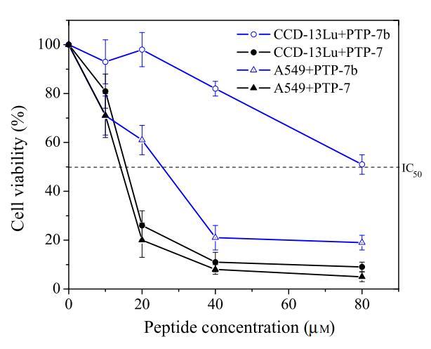 在細胞毒性研究中,選擇了研究充分的pH敏感裂解肽PTP-7b(FLGALFKALSHL)(6,9)。由于PTP-7b的過渡pH(pH=7.25)低于A549的表面pH,但高于CCD-13Lu,因此裂解肽PTP-7b對A549的毒性可能比對CCD-13Lu細胞的毒性更大。選擇PTP-7b的親本肽PTP-7(FLGALFKALSKLL),一種pH不敏感的裂解肽(6,9)作為對照。如圖8所示,盡管肽PTP-7對兩種細胞的活性相同,但pH敏感肽PTP-7b對A549的毒性大約是對CCD-13Lu的三倍。